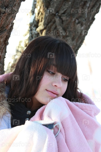 Девушка, завернутая в одеяло, с чашкой чая в зимнем лесу