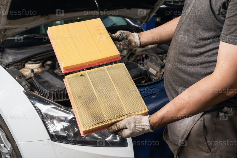 Автомеханик показывает старый и новый воздушный фильтр двигателя для легкового автомобиля