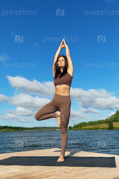 Привлекательная женщина, выполняющая упражнение Врикшасана, поза дерева, стоящая с поднятыми и соединенными вместе руками, тренирующаяся в леггинсах и коротком топе на берегу озера теплым солнечным утром