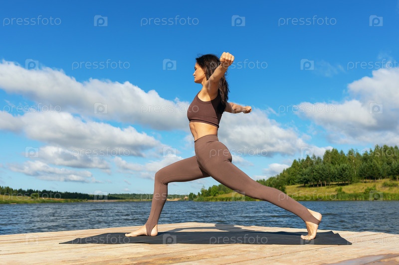 Привлекательная женщина, выполняющая вариацию упражнения Вирабхадрасана, позу воина, тренирующаяся в леггинсах и коротком топе, стоя на берегу озера теплым солнечным утром