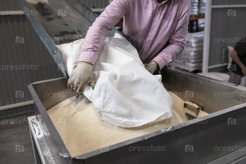 Рабочий высыпает мешок сахара на конвейер для дальнейшей обработки