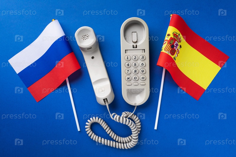 Старый телефон и флаги России и Испании на синем фоне, концепция на тему телефонных разговоров между странами