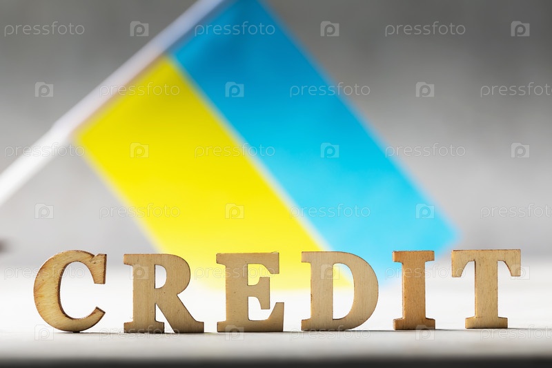 Текст с деревянными буквами и украинским флагом на абстрактном фоне, концепция на тему долгового бремени народа Украины