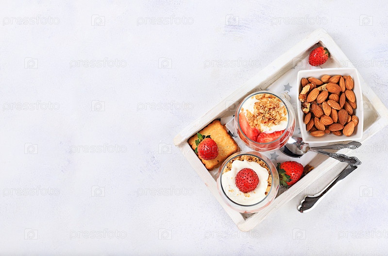 Здоровый завтрак с ингредиентами. Клубничный йогурт с ягодами, французским крекером и мюсли на ярком столе, фруктовый салат, детокс-диета и концепция естественного питания, образ жизни, детское питание,