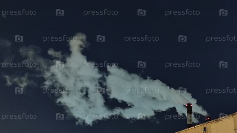 Темно-синее зимнее небо. Ясное ночное небо без облаков. Пар и дым из трубы работающего предприятия поднимаются в небо. Светло-серый дым наклонен из-за ветра, дующего справа налево