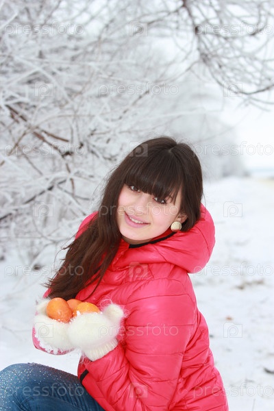 Счастливая девушка с мандаринами в руках в зимнем лесу
