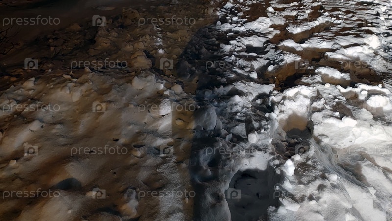 Белый неровный снежный покров. Зимний вечер. Снег полностью покрывает поверхность земли на нем, следы ступившего по нему человека. Свет освещается косыми лучами фонаря