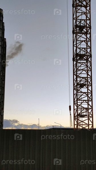 Ряд здания огорожен забором. Зимний вечер ясное бледно-голубое небо почти без облаков. Высокий металлический забор, за которым стоит высотный строительный кран