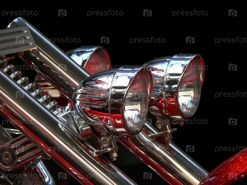 Хромированные фары байка на черном фоне