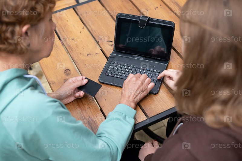 Внучка учит бабушку пользоваться планшетом