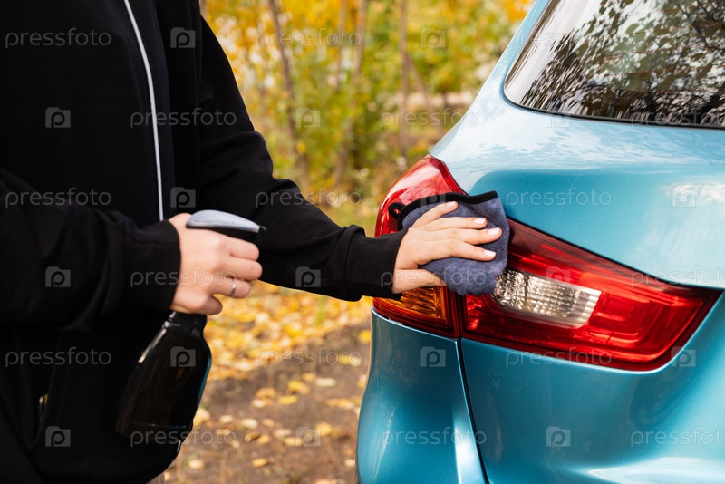 Служба дезинфекции автомобилей. Женщина обеззараживает и чистит внутреннюю ручку двери автомобиля. Безопасность и профилактика заражения вирусом Covid-19, заразиться микробами или бактериями, протереть чистые поверхности