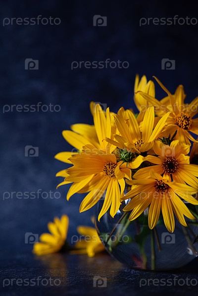 Букет желтых цветов на темном фоне в стиле гранж, абстрактная цветочная композиция, день матери, свадебный подарок, весенний или осенний фон с местом для текста, минималистичная концепция праздника, сдержанный натюрморт,