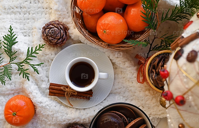 Сладкая еда, вид сверху, для веселого Рождества или новогоднего праздничного украшения - шоколадные конфеты, мандарины, печенье, зефир и какао-латте на белом дереве