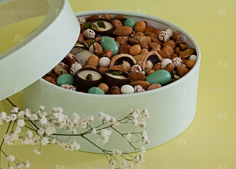 Арахис в коробке. Подарок к Женскому дню (8 марта), Женскому дню. День матери, День святого Валентина. Праздничная круглая коробочка