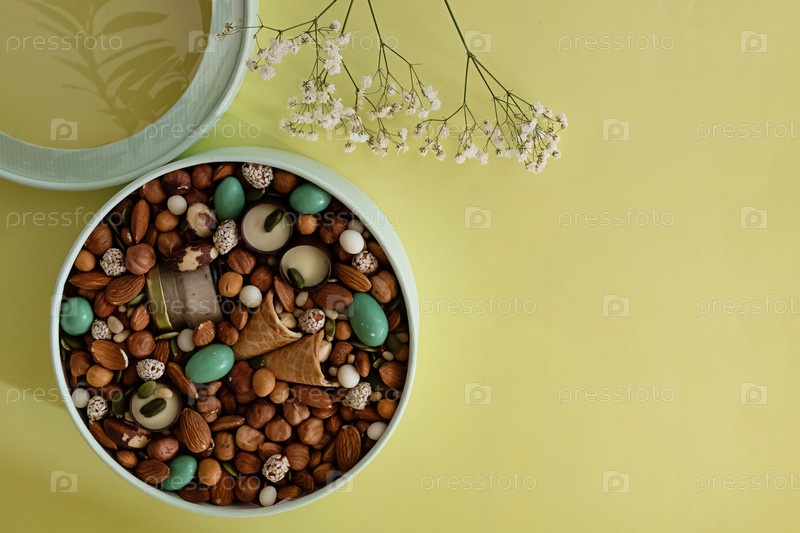 Арахис в коробке. Подарок к Женскому дню (8 марта), Женскому дню. День матери, День святого Валентина. Праздничная круглая коробочка