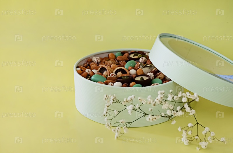 Арахис в коробке. Подарок к Женскому дню (8 марта), Женскому дню. День матери, День святого Валентина. Праздничная круглая коробочка