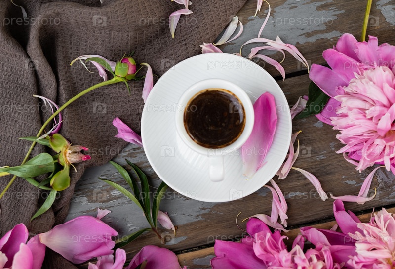 Натюрморт с пионами и чашкой кофе на темном фоне. Подарочная карта. Свадебная открытка