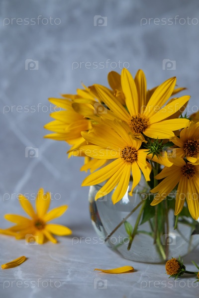 Букет красивых желтых цветов, очков и книги на подоконнике. День матери. Свадьба. Открытка