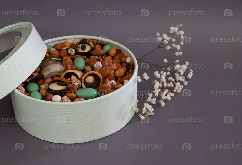 Арахис в коробке. Подарок к Женскому дню (8 марта), Женскому дню. День матери, День святого Валентина. Праздничная круглая коробочка
