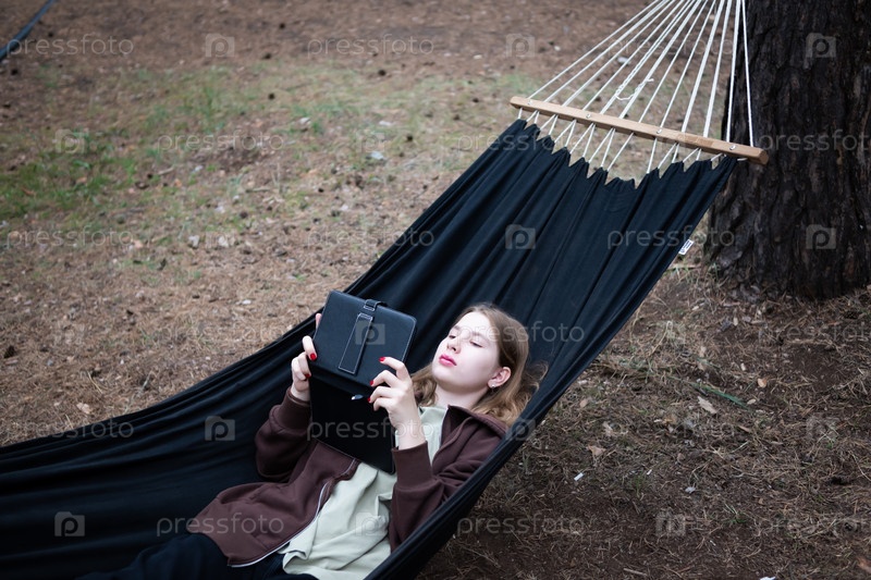 Девушка в гамаке работает за компьютером