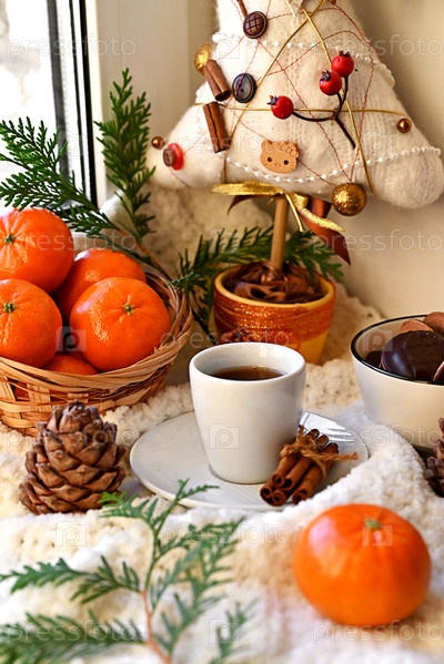 Натюрморт с бокалами глинтвейна или фруктового чая, красными цветами Пуансеттии, еловой веткой и специями на темном фоне с копировальным пространством. Сервировка новогоднего и рождественского стола. Поздравительная открытка