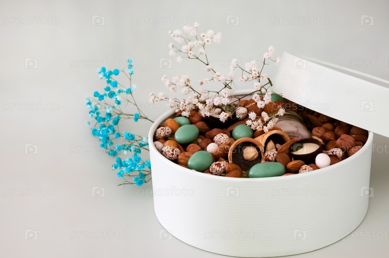 На светлом фоне — круглая коробка, наполненная различными орехами и сухофруктами. День матери. День святого Валентина. Международный женский день. Восхитительный подарок. Нежирная пища