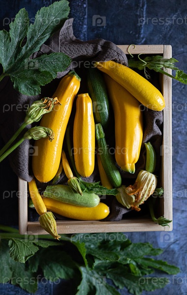 Цуккини. Свежие сырые органические кабачки, готовые к приготовлению, вид сверху с местом для копирования