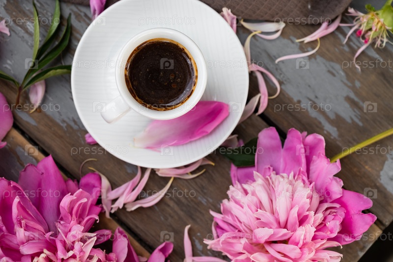 Розовые цветы пиона и чашка кофе на белом фоне. Утро, весна, модная композиция. Плоская планировка, вид сверху, пространство для копирования