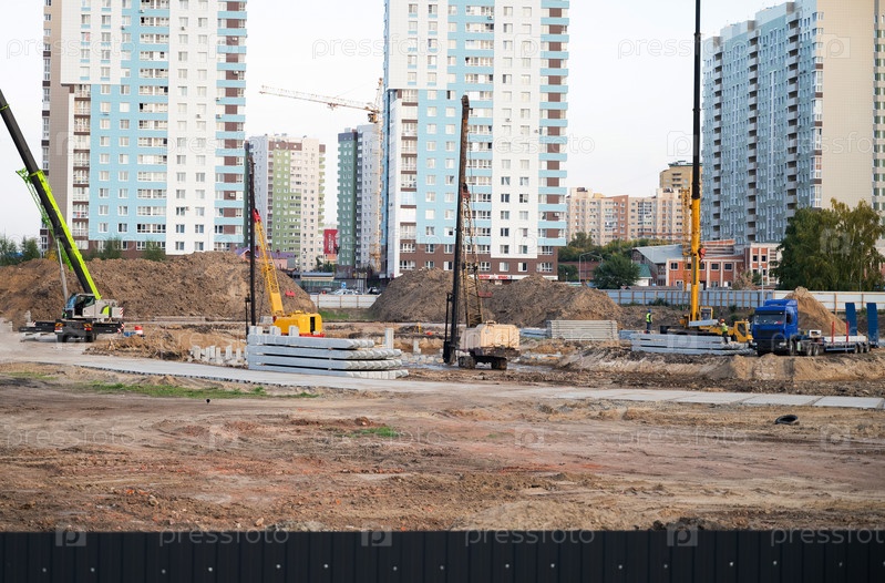 Бетонные работы на строительной площадке. Строители заливают жидкий бетон из цементобетонного бункера на установку опалубки