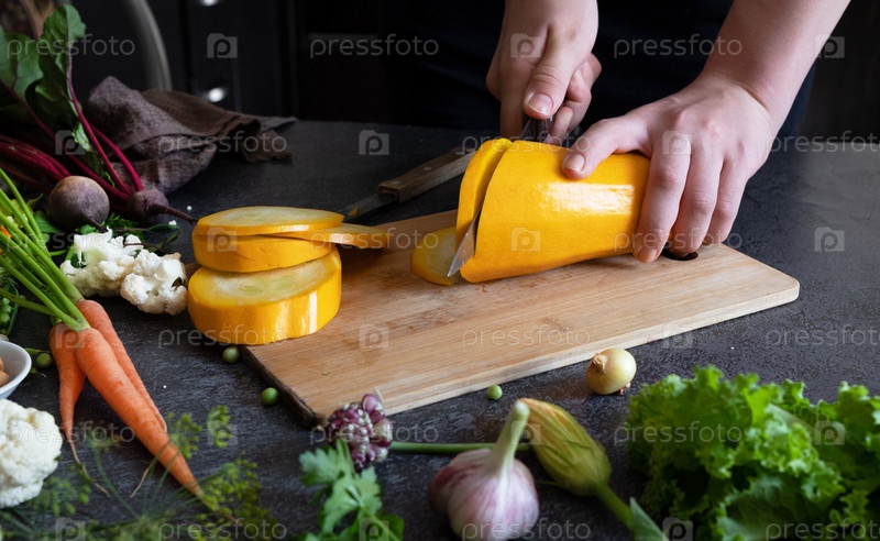 Крупным планом руки молодой женщины режут кабачки на деревянной разделочной доске дома. Молодая женщина готовит здоровую пищу