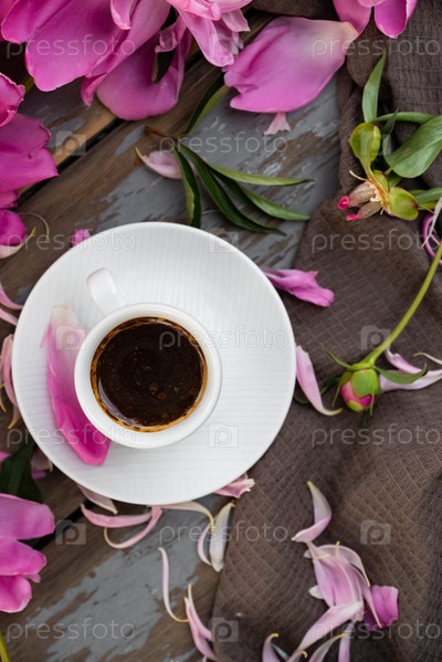 Розовые цветы пиона и чашка кофе на белом фоне. Утро, весна, модная композиция. Плоская планировка, вид сверху, пространство для копирования