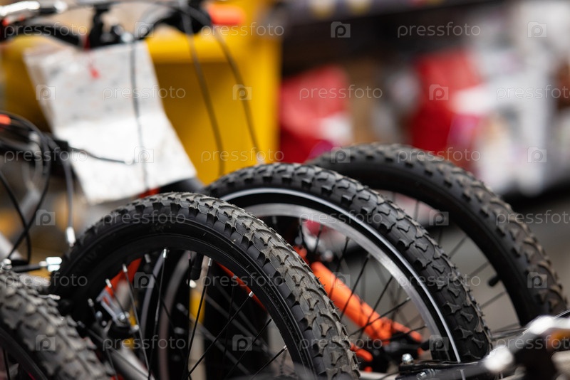 Магазин велосипедов, ряды новых велосипедов, магазин велосипедов