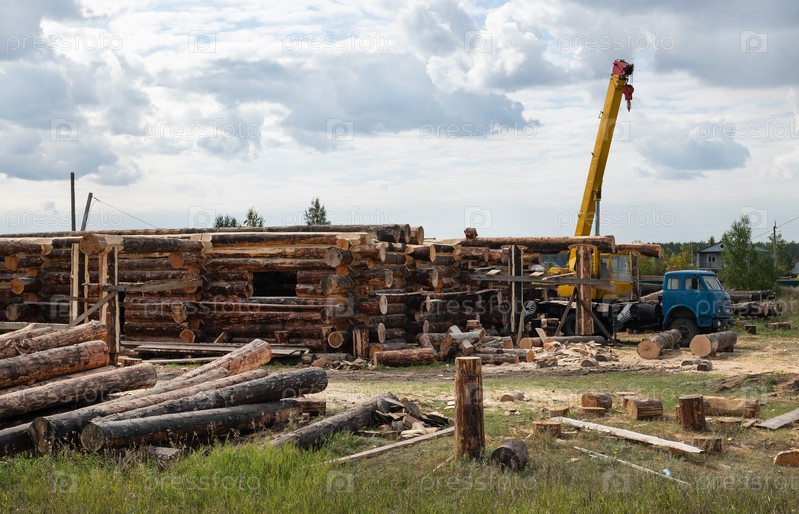 Заготовка древесины для лесной промышленности или концепция строительства деревянного домостроения. Большая поленница из распиленных окоренных бревен сосны