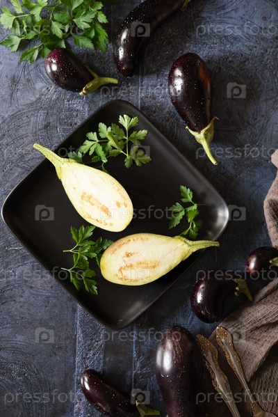 Сырые свежие полосатые баклажаны, темный фон, деревенский стиль, выборочный фокус, сдержанный ключ