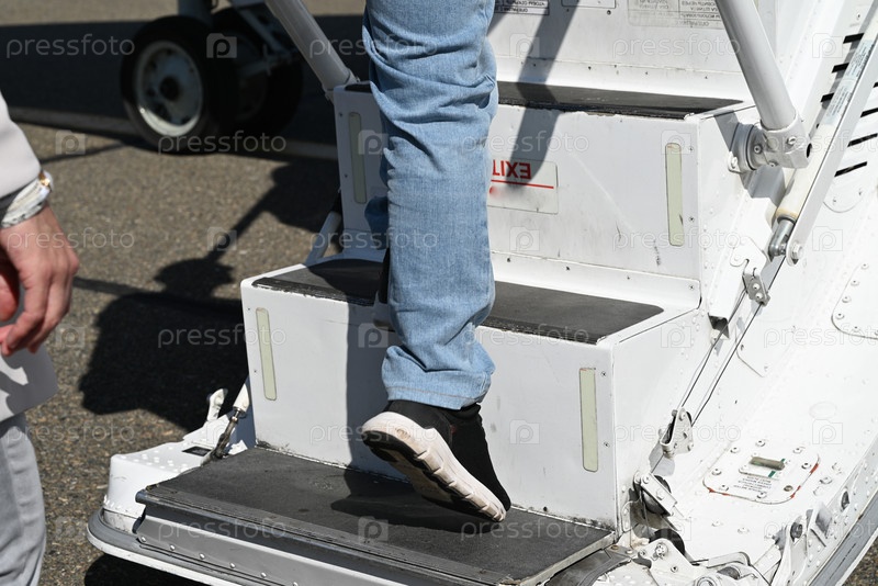 Лестница у заднего входа пассажирского самолета, вид на хвост и перрон аэропорта