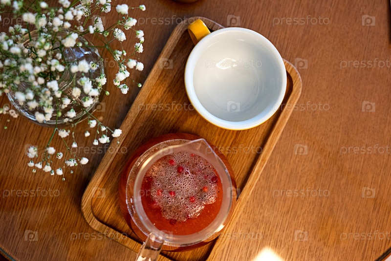 Чай из калины в стеклянной чашке с корицей и анисом. Крупный план. Селективный фокус