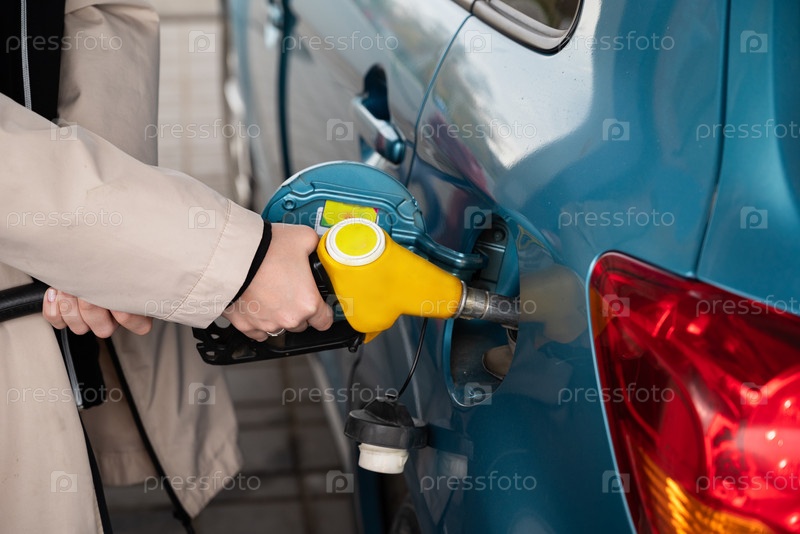 Привлекательная молодая женщина заправляет машину на заправочной станции. Женщина заправляет дизельное топливо бензином в машине с помощью топливной форсунки. Концепция бензина. Вид сбоку