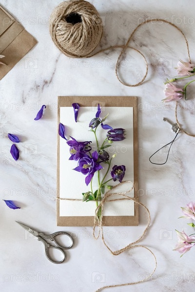 Мраморный письменный стол с розовыми и голубыми цветами, открытка, крафт-конверт, шпагат, хлопковая ветка. Макет Женского дня или Дня матери, Дня святого Валентина, плоское положение, вид сверху
