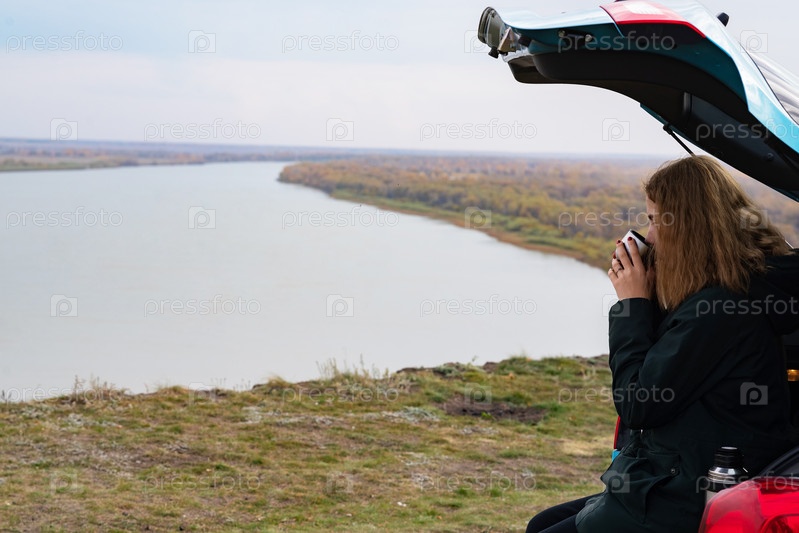 Счастливая молодая белая женщина в свитере пьет чай, сидя в багажнике машины на высоком берегу реки