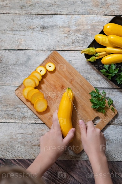 Нарезаем кабачки на разделочной доске. Спелые кабачки на сером фоне. Вид сверху, горизонтальный