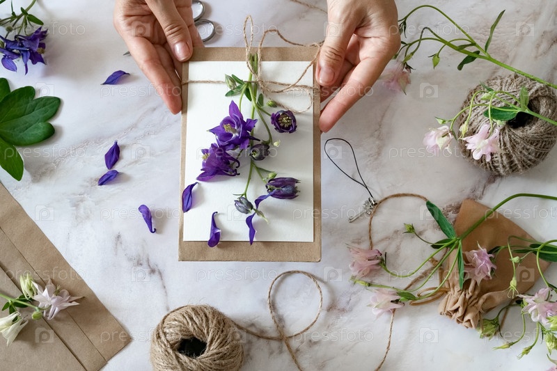 Крупный план рук молодой женщины-флориста, создающей приглашение, вложенной в конверт с цветущими цветами, вид сверху. Макро. Изолированные на белом фоне. Со свободным местом для вашего текста