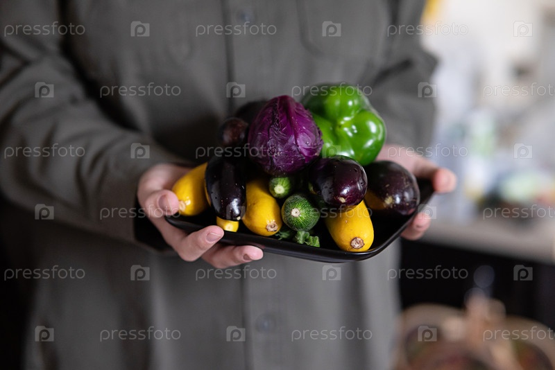 Руки держат большую тарелку с различными свежими фермерскими овощами. Диета. Баланс. Концепция здоровой органической пищи