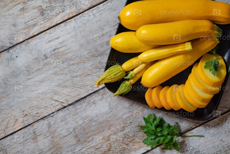 Свежие оранжевые кабачки. Спелые овощи собирают на деревянной подставке. Стол из старинных досок, место для копирования