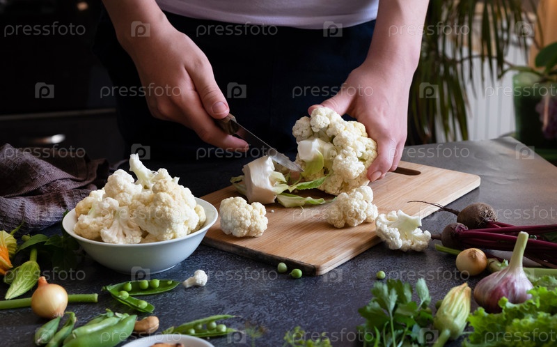 Женщина режет свежую цветную капусту за столом