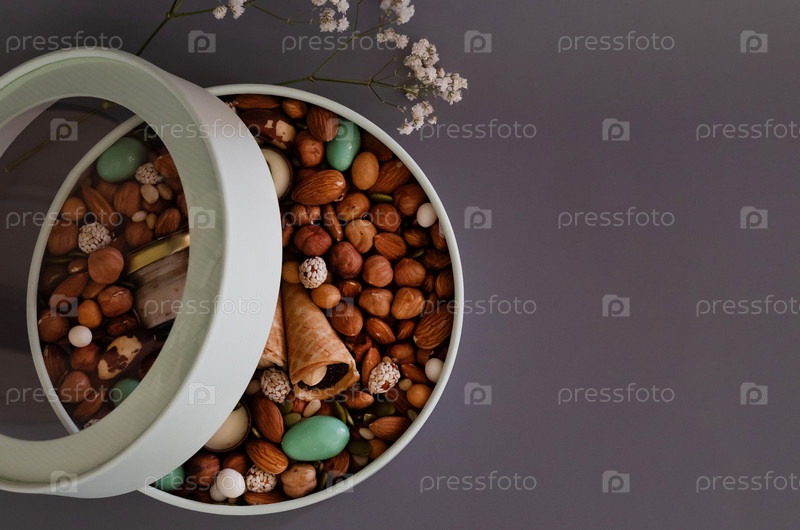 На светлом фоне — круглая коробка, наполненная различными орехами и сухофруктами. День матери. День святого Валентина. Международный женский день. Восхитительный подарок. Нежирная пища
