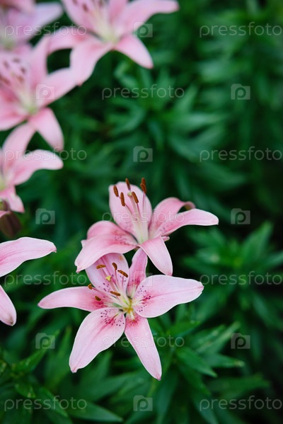 Цветущие розовые цветы лилии на зеленом фоне с листьями крупным планом
