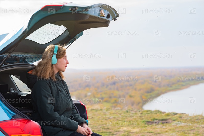 Маленькая девочка стоит на высоком берегу и смотрит на красивую природу