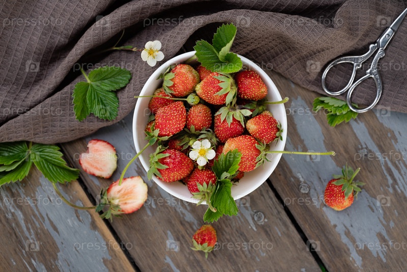 Клубничное растение фон. Спелые красные органические ягоды в миске. Селективный фокус. Собирайте экологически чистые фрукты
