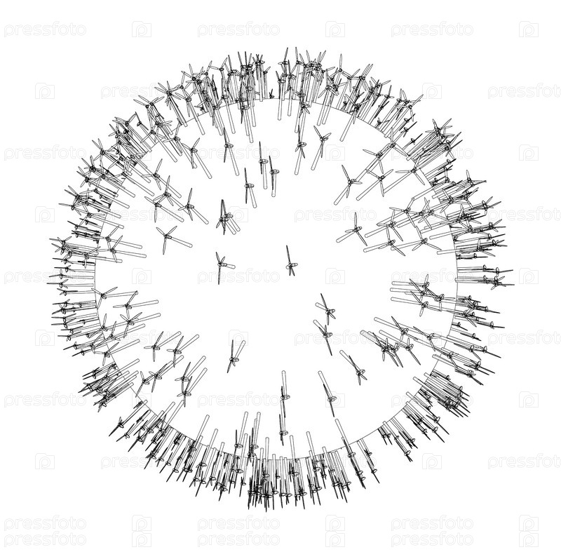 Электрические ветряные турбины на круглой планете. Векторное рендеринг 3d. Каркасный стиль. Слои видимых и невидимых линий разделены