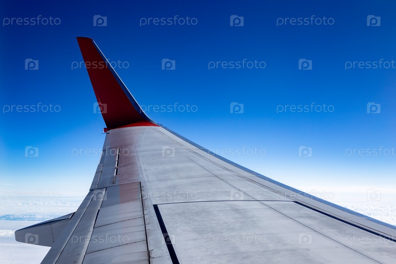 Крыло самолета во время полета на фоне облаков и голубого неба